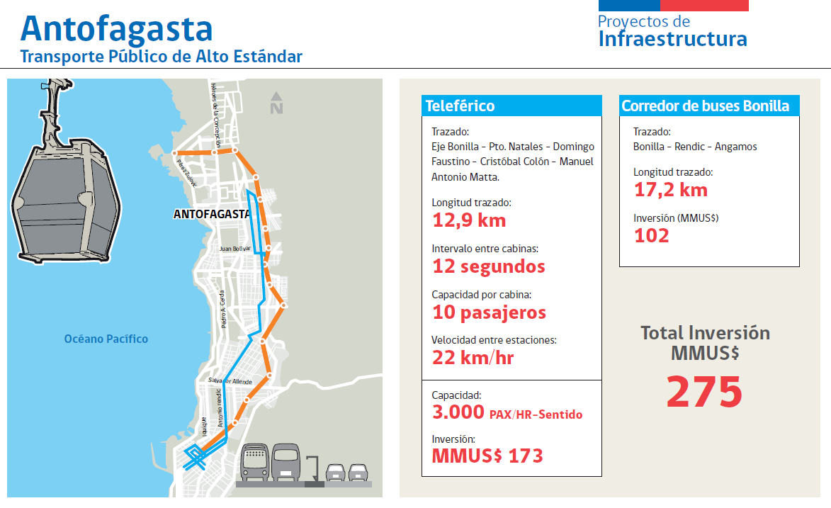 Antofagasta se verá beneficiada con una solución similar, que conectará el sector nororiente y el centro de la ciudad, eje que concentra la mayor cantidad de viajes en la capital de la Segunda Región. Este Metrocable de 13 kilómetros (que cubrirá el eje Bonilla–Puerto Natales–Domingo Faustino Sarmiento-Cristóbal Colón–Manuel Antonio Matta) será complementado con un corredor exclusivo para transporte público de 17 kilómetros. El monto total de la inversión superará los 275 millones de dólares.