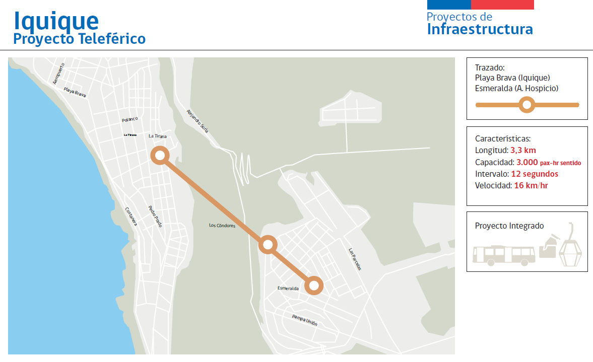 Para Iquique se contempla la construcción de un teleférico de 3,3 kilómetros que unirá la capital regional de Tarapacá con Alto Hospicio. Este nuevo teleférico tendrá tres estaciones y la inversión se estima actualmente en 45 millones de dólares.