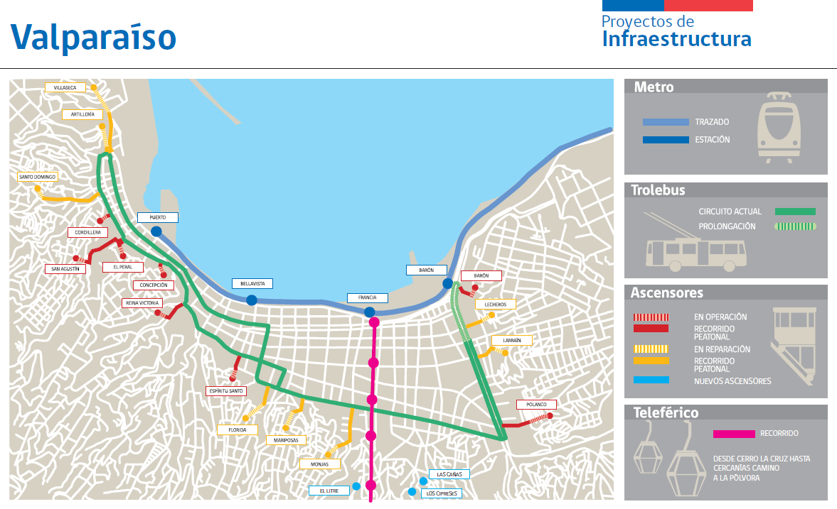Otra iniciativa que generará un positivo impacto en términos de comodidad y tiempos de viaje, es el nuevo teleférico que se estudiará para Valparaíso a efectos de enlazar, la estación Francia del Metro Regional de Valparaíso, con la parte alta de Valparaíso, pasando por el Hospital Carlos Van Büren, cuya inversión se estima en 66 millones de dólares.