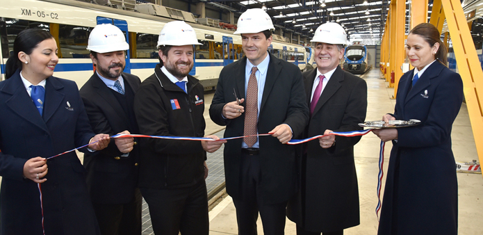 El ministro de Transporte y Telecomunicaciones, Andrés Gómez-Lobo, el presidente de Grupo EFE, Jorge Inostroza, y el intendente de la Región Metropolitana, Claudio Orrego, cortaron la cinta para inaugurar los nuevos talleres ubicados en la Maestranza San Eugenio, que ya albergan los 16 nuevos trenes que operarán los servicios Nos y Rancagua Express, a partir del primer semestre de 2016.
