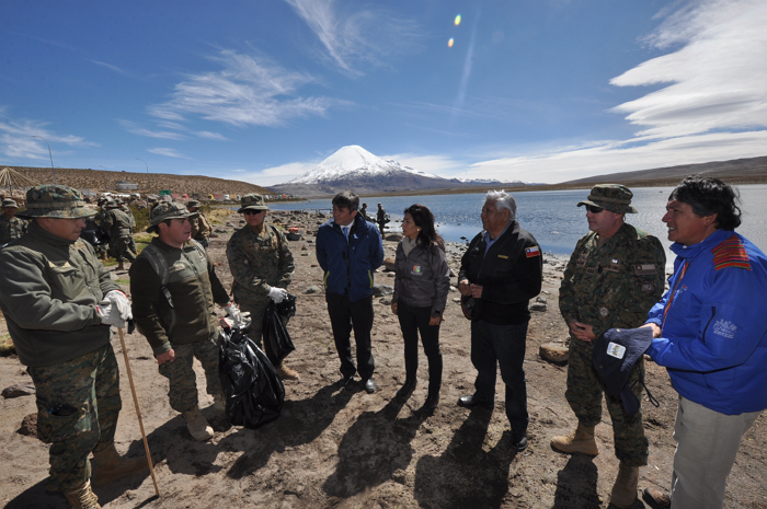 Por cerca de cinco horas, más de 400 habitantes de Arica y Parinacota, liderados por el subsecretario de Medio Ambiente, Marcelo Mena; la intendenta Gladys Acuña; el gobernador de Parinacota Roberto Lau y el embajador en Misión Especial del Minrel, Gabriel Gaspar; subieron al altiplano chileno a recoger cientos de kilos de basura que rodean la ribera del Lago Chungará y la Ruta 11 CH, que conecta a Bolivia con territorio chileno.