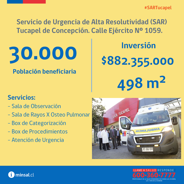 El nuevo Servicio de Urgencia de Alta Resolutividad, SAR Tucapel es uno de los 7 SAR comprometidos para ser habilitados en la red de atención primaria de salud jurisdicción del Servicio de Salud Concepción y el tercero en entrar en funcionamiento en modalidad Marcha Blanca.