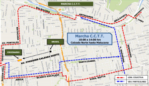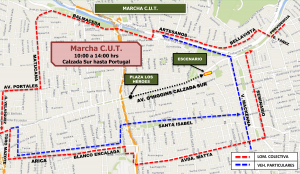 En la reunión, realizada en dependencias de la Intendencia Metropolitana, se analizó el recorrido autorizado, que tiene su inicio en el sector de la Plaza Los Héroes, avanza por la calzada sur de la Alameda hasta Santa Rosa, y ahí ocupa ambas calzadas hasta Portugal, donde estará ubicado el escenario de la CUT.