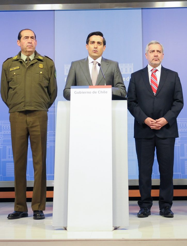 Al término de la reunión, el titular de Interior explicó que “hemos recibido con satisfacción esta madrugada la noticia de la detención de tres presuntos participantes en los actos terroristas que hemos conocido en los últimos meses. Yo quisiera en estos momentos, a nombre del Gobierno, agradecer al fiscal Guzmán y su equipo, y al Ministerio Público que con dedicación, con trabajo, en estas semanas de mucho esfuerzo, han logrado tener resultados muy positivos” y agregó que “así también agradecer y felicitar al equipo de Carabineros, encabezado por el General Director Gustavo González y en especial por el general Villalobos, por este trabajo tan importante en beneficio del país”.