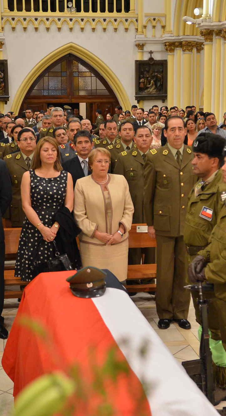 La Presidenta de la República, Michelle Bachelet, acompañada del ministro de Interior y Seguridad Pública, Rodrigo Peñailillo, encabezó esta noche el responso en memoria del cabo primero de Carabineros Víctor Godoy y el sargento primero Germán Cid, ambos fallecidos cerca de la frontera con Perú, mientras realizaban un patrullaje de rutina cerca de la localidad de Tacora.