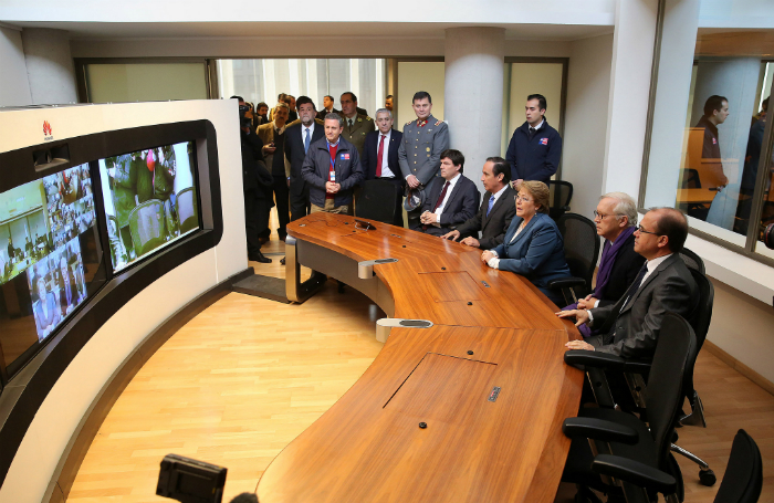 Esta mañana la Presidenta de la República, Michelle Bachelet, junto al ministro del Interior y Seguridad Pública, Jorge Burgos, el subsecretario del Interior, Mahmud Aleuy, el Director Nacional de Onemi, Ricardo Toro, los ministros de Obras Públicas y Transporte y los altos mandos de Carabineros y PDI, inauguró oficialmente las nuevas dependencias de la Oficina Nacional de Emergencias.