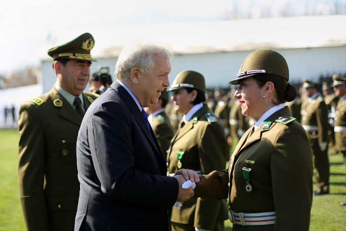 “Todos ustedes saben que Carabineros es una de las instituciones más queridas por los chilenos, tal como lo demuestran distintos estudios de opinión pública. Y ese prestigio no es gratuito ni fruto del azar. Ese cariño es, por sobre todo, producto del trabajo de cada uno de ustedes. A fin de cuentas son ustedes quienes están a diario en la calle, ayudando al prójimo, previniendo el delito, protegiendo los espacios públicos y dando mayor seguridad a las personas. Creo que ese afecto de los chilenos y chilenas hacia Carabineros de Chile es el mejor reconocimiento que se puede recibir por una vida dedicada al servicio público”, expresó el secretario de Estado al término de la ceremonia.