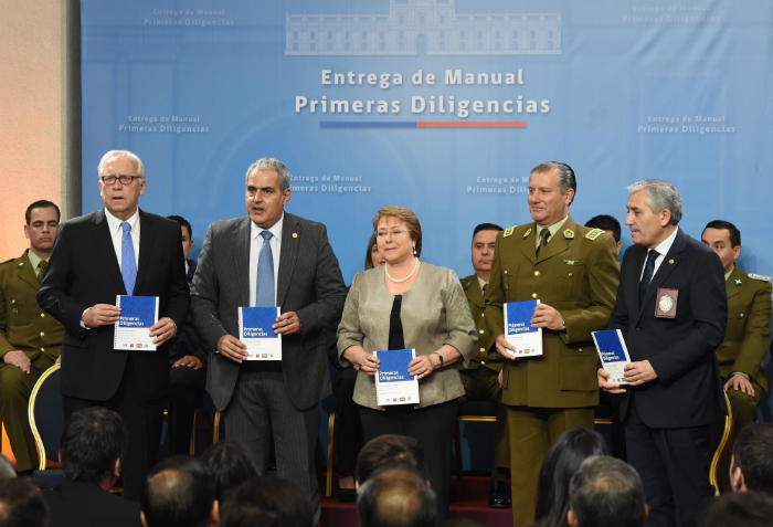 Como un instrumento para mejorar los tiempos de respuesta y levantar evidencias útiles en los delitos de mayor connotación social, la Presidenta de la República, Michelle Bachelet, junto al ministro del Interior y Seguridad Pública, Jorge Burgos, y el Fiscal Nacional, Sabas Chahuán, entregó la mañana de este martes el Manual de Primeras Diligencias en delitos de robo al general director de Carabineros, Bruno Villalobos, y al director general de la Policía de Investigaciones, Héctor Espinosa.