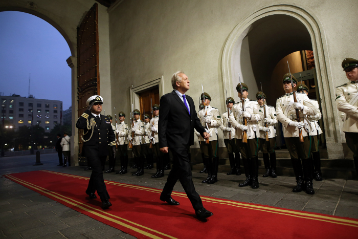 El cabo 1° Pedro Farías afina el clarín. Cuando hace frío, como la mañana de este miércoles, tiene que calentar la boquilla con sus manos. Mientras otros carabineros estiran la alfombra roja, y se encargan de encender los tubos incandescentes que iluminan el ingreso por calle Moneda del palacio.