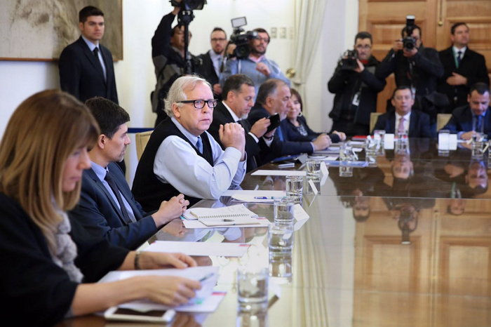 A la reunión asisten los ministros Rodrigo Valdés (Hacienda), Nicolás Eyzaguirre (Segpres), Marcelo Díaz (Segegob) y Ximena Rincón (Trabajo y Previsión Social), para analizar la Cuenta Pública Presidencial realizada el pasado sábado 21 de mayo.
