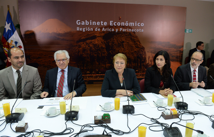 El Ministro del Interior y Seguridad Pública acompañó a la Presidenta de la República, Michelle Bachelet, a su gira por la región de Arica y Parinacota en la que también participaron los ministros de Hacienda, Obras Públicas y Vivienda y Urbanismo. En la primera actividad de la jornada, la Mandataria, los secretarios de Estado y la intendenta de la Región, sostuvieron un Gabinete Económico Regional.