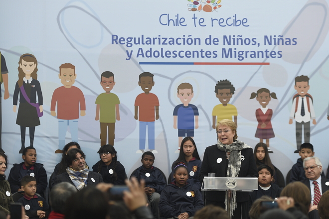 Durante la mañana de este miércoles, la Presidenta Michelle Bachelet acompañada del ministro del Interior y Seguridad Pública llegó hasta la comuna de Recoleta para anunciar el inicio del proceso de regularización de niños, niñas y adolescentes migrantes en el marco del Plan “Chile te Recibe”.
