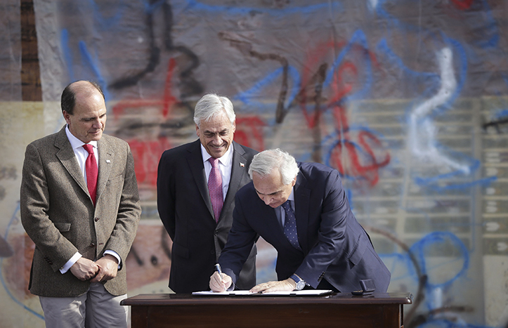 Junto a los ministros del Interior, Andrés Chadwick, de Vivienda, Cristián Monckeberg, y de la Secretaría General de la Presidencia, Gonzalo Blumel, el mandatario develó un mural cubierto, simbólicamente, con una capa de rayados. El trabajo artístico es ahora la nueva portada del Matadero Franklin en la comuna de Santiago.