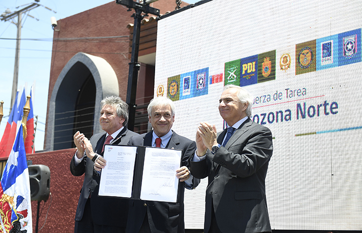 “El combate tiene que ser con total unidad y tiene que ser con total voluntad”, indicó el Presidente Sebastián Piñera al recorrer las dependencias de la primera oficina de la Fuerza de Tarea Contra el Crimen Organizado en la ciudad de Iquique, junto al Ministro del interior, Andrés Chadwick, de Defensa, Alberto Espina y las máximas autoridades de las instituciones involucradas en el resguardo de las fronteras marítimas, terrestres y del espacio aéreo.