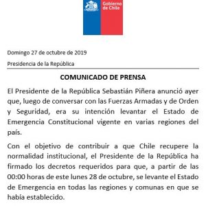 Con el objetivo de contribuir a que Chile recupere la normalidad institucional, a partir de las 00:00 de este lunes 28 de octubre, se levanta en todo Chile el Estado de Emergencia y el Toque de Queda.