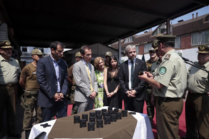 Santiago 18 de diciembre. – El ministro del Interior y Seguridad Pública, Gonzalo Blumel, junto a la subsecretaria de Prevención del Delito, Katherine Martorell y el General Director de Carabineros, Mario Rozas, participaron en la entrega de 310 cámaras corporales por parte de la Asociación de Municipios Metropolitanos para la Seguridad Ciudadana, integrada por los municipios de Providencia, Santiago y Estación Central, a la policía uniformada.