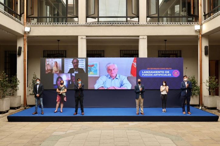 El Presidente de la República, Sebastián Piñera, junto al ministro del Interior y Seguridad Pública, Rodrigo Delgado; y el de Justicia y Derechos Humanos, Hernán Larraín; los alcaldes de Maipú, Kathy Barriga; Peñalolén, Carolina Leitao; Renca, Claudio Castro; y La Florida, Rodolfo Cárter; promulgó este domingo de manera telemática la ley que sanciona como delito el uso, venta y fabricación de fuegos artificiales.