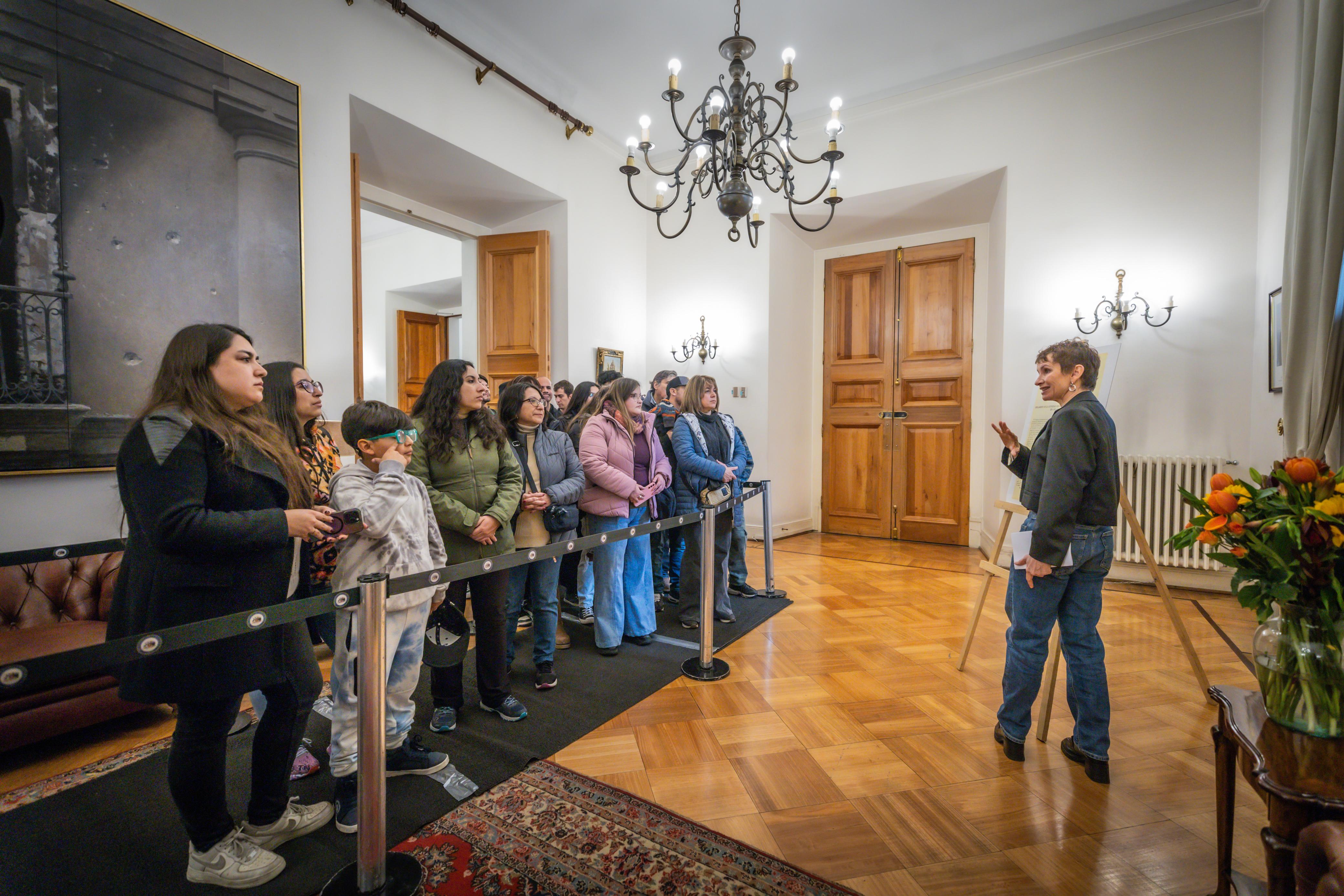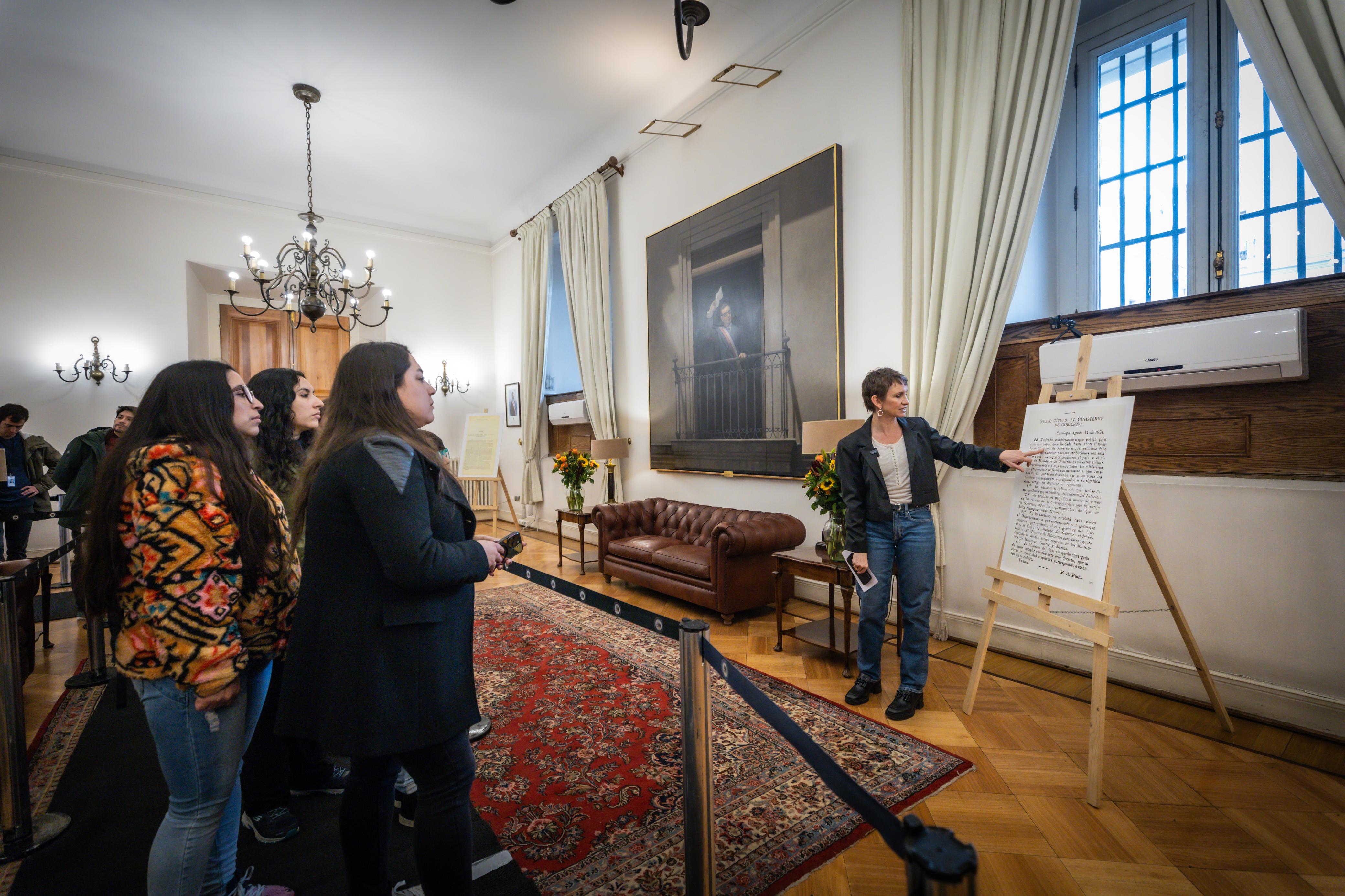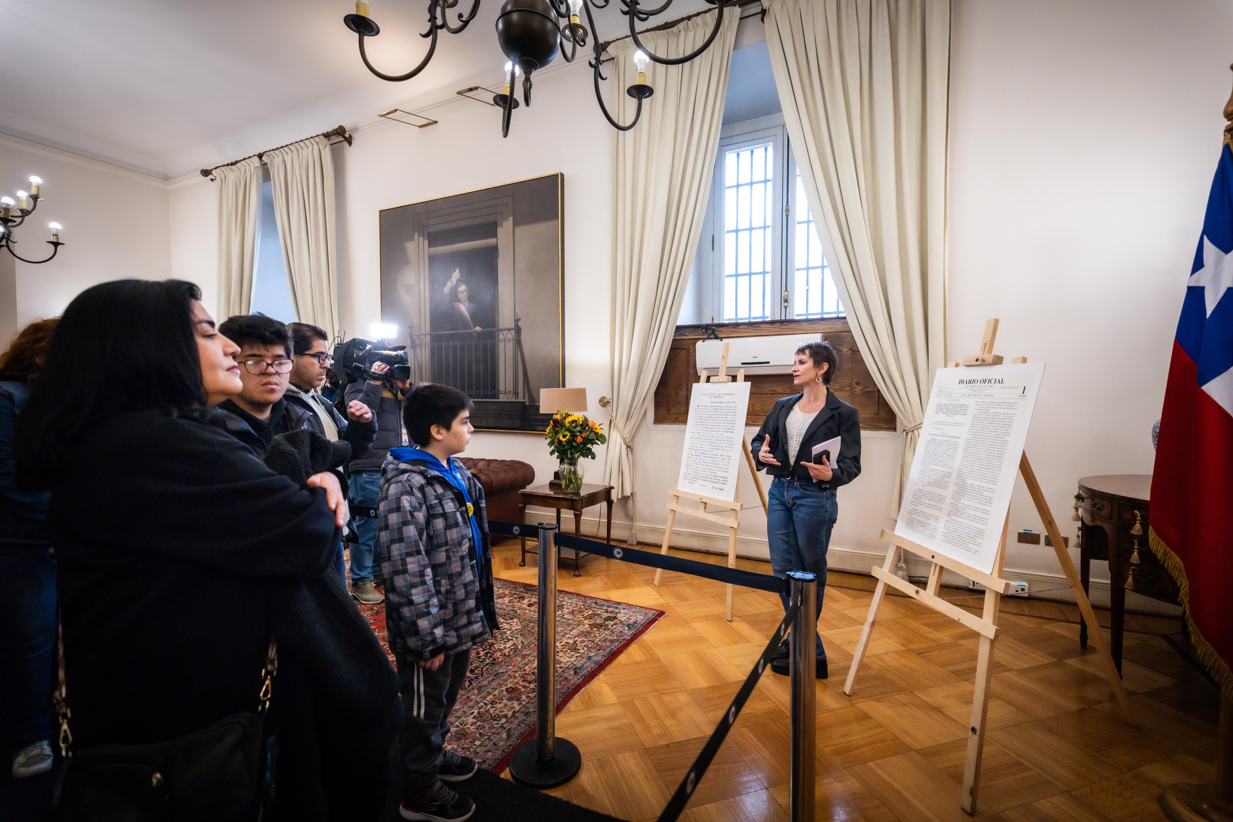 La secretaria de Estado recibió en las puertas del ministerio a distintos grupos, a quienes les explicó la importancia que ha tenido la cartera en la historia de Chile, los lugares donde ha funcionado y el papel que juega actualmente en la coordinación política del gobierno y la seguridad pública.