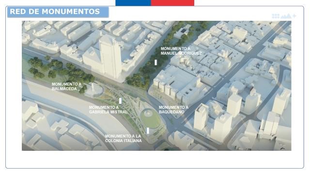 Al ser un espacio tan relevante para la ciudad, se consideró también el diseño de un monumento a Gabriela Mistral, lo que contribuye a consolidar el sector como un polo de monumentos que da cuenta de diversos personajes y momentos relevantes para nuestra historia.