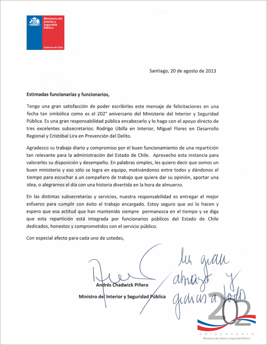 El jefe de gabinete envió una carta a todos los funcionarios para felicitarlos y “agradecer su trabajo diario y compromiso por el buen funcionamiento de una repartición tan relevante para la administración del Estado de Chile”.