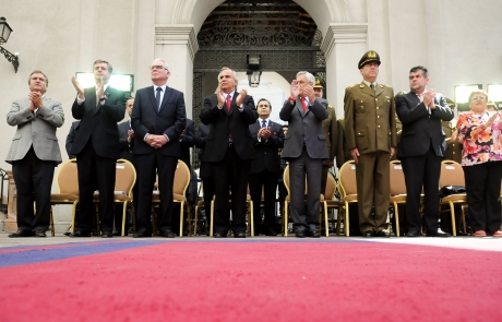El Presidente de la República, Sebastián Piñera, acompañado del ministro del Interior y Seguridad Pública, Andrés Chadwick y los subsecretarios Rodrigo Ubilla y Cristóbal Lira, realizó hoy en el Palacio de La Moneda un reconocimiento a servicios destacados de Carabineros y la Policía de Investigaciones.