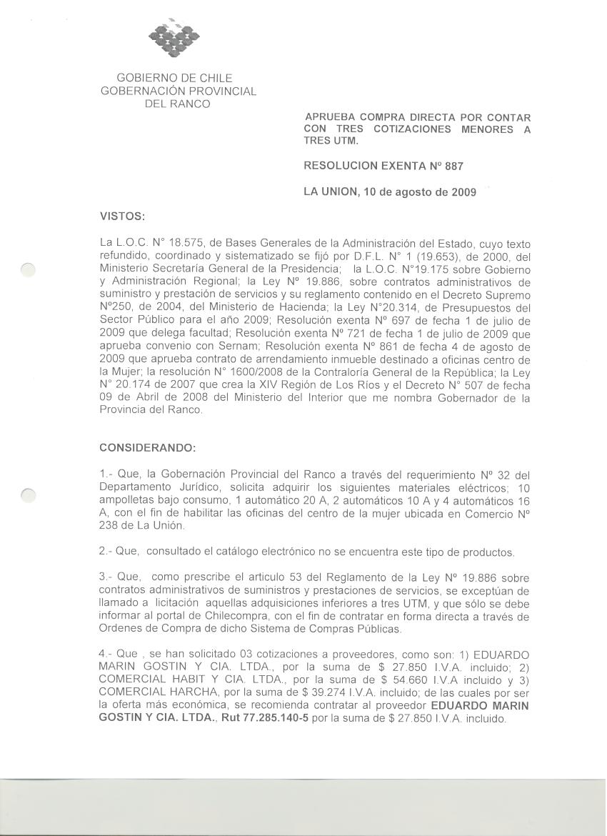 | 31 | 10/08/2008 | Resolución Exenta 887 | Adquisición de materiales eléctricos, con el fin de habilitar Centro de la Mujer | 10/08/2009 | 10/08/2009 | Pesos | 27850 | Eduardo Marín Gostín y Cia. Limitada | No | No | No | 77.285.140-5 | Eduardo Marín | Ver enlace | - | null |