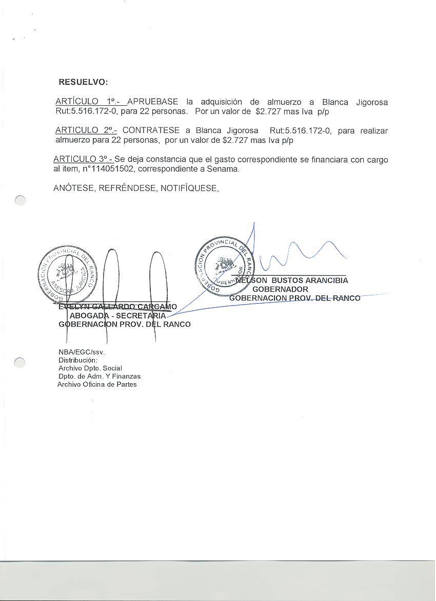| 2 | 21/04/2009 | Resolución Exenta 369 | Servicio de almuerzo, encuentro de Adulto Mayor Río Bueno | 21/04/2009 | 21/04/2009 | Pesos | 71392 | Blanca Jigorosa Brana | Jigorosa | Brana | Blanca | 5.516.172-0 | Blanca Jigorosa | Ver enlace | - | null |
