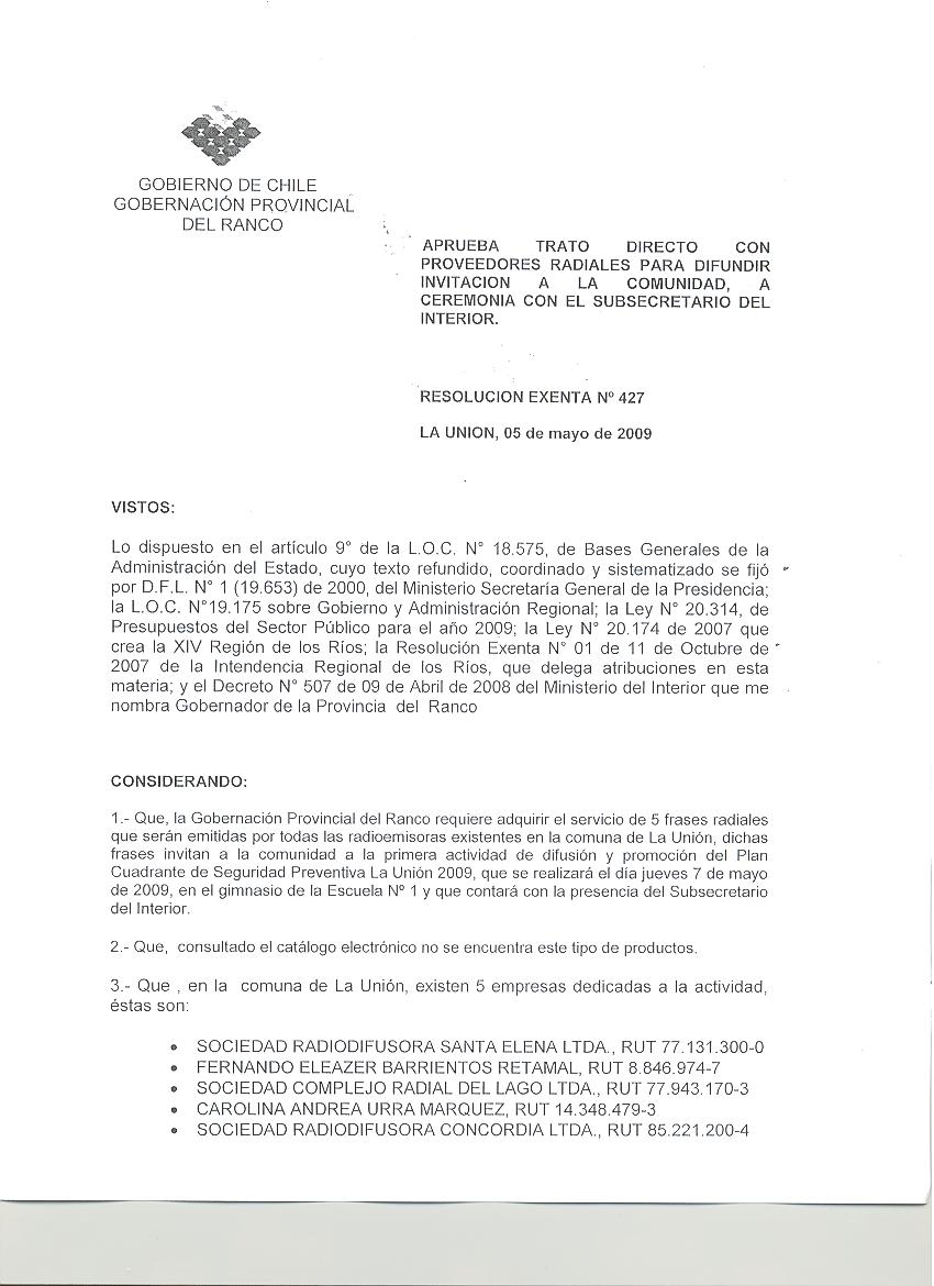 | 17 | 05/05/2009 | Resolución Exenta N° 427 | Adquisición de 5 frases radiales visita Subsecretario del Interior | 05/05/2009 | 06/05/2009 | Pesos | 17850 | Sociedad Radiodifusora Concordia Ltda. | No | No | No | 85.221.200-4 | No | Ver enlace | - | null |