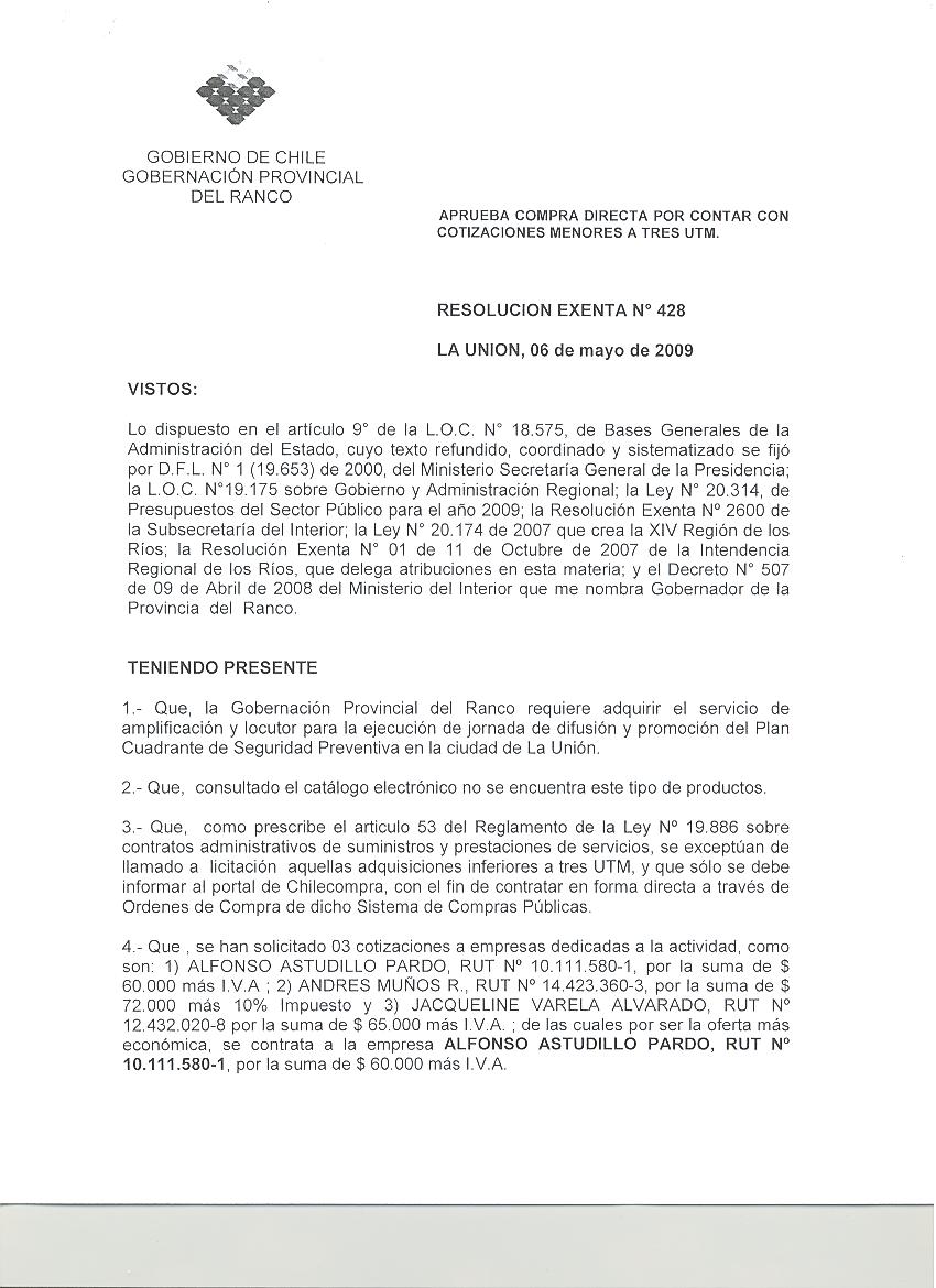 | 18 | 06/05/2009 | Resolución Exenta N° 428 | Servicio de amplificación y locución ceremonia Plan Cuadrante | 06/05/2009 | 06/05/2009 | Pesos | 71400 | Alfonso Astudillo Pardo | Astudillo | Pardo | Alfonso | 10.111.580-1 | No | Ver enlace | - | null |