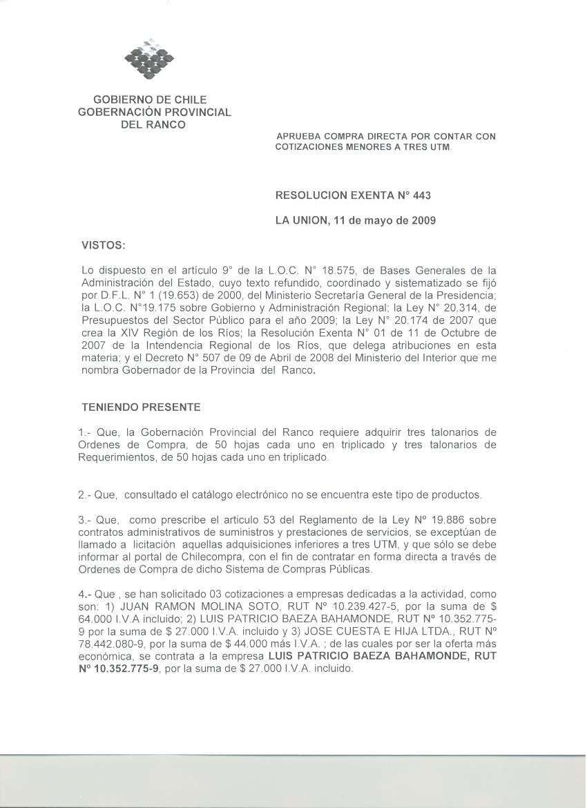| 21 | 11/05/2009 | Resolución Exenta N° 443 | Adquisición de formularios y órdenes de compras | 11/05/2009 | 11/05/2009 | Pesos | 27000 | No | Baeza | Bahamonde | Luis Patricio | 10.352.775-9 | No | Ver enlace | - | null |