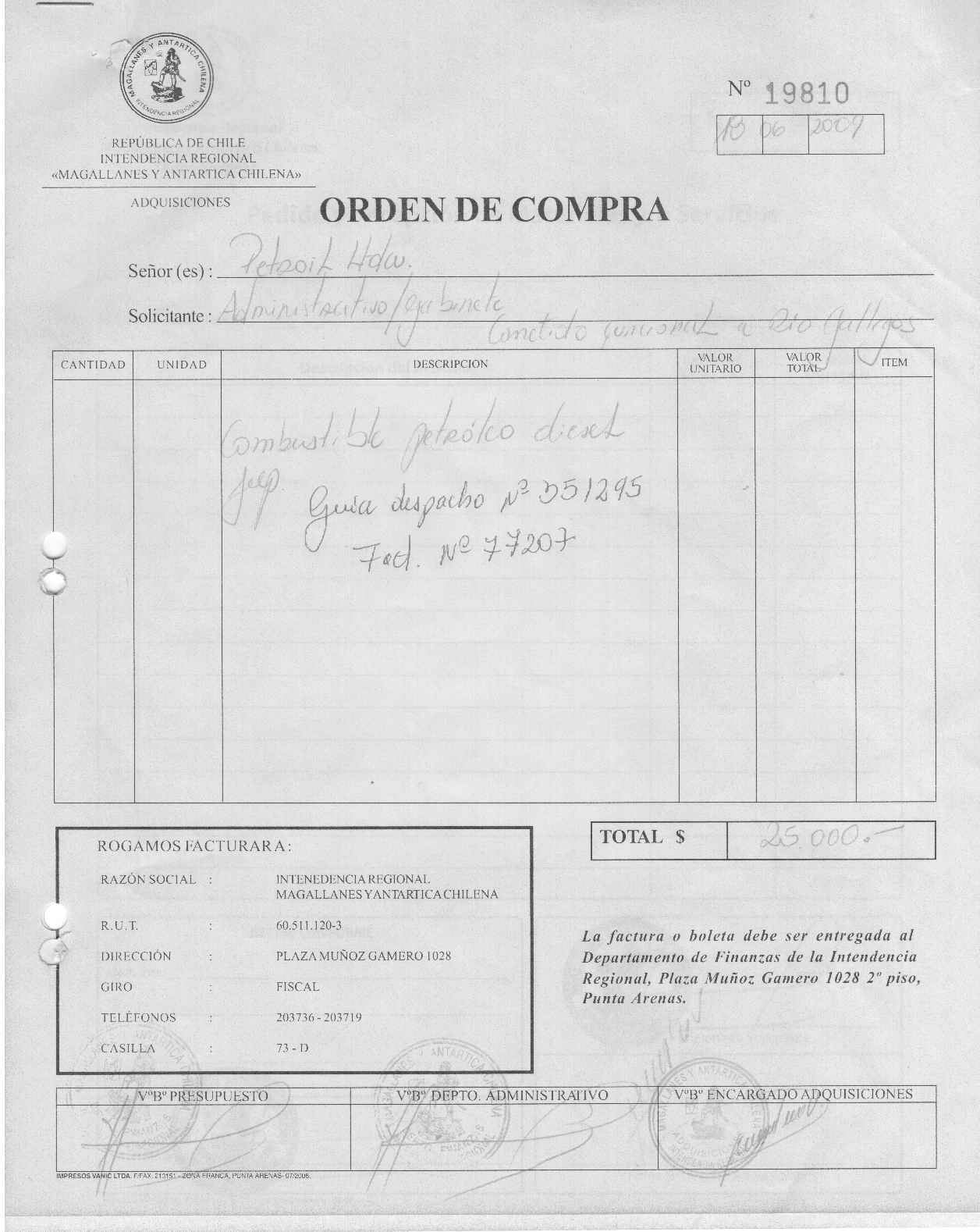 | 54 | 18/06/2009 | Orden de Comrpa N° 19810 | Combustible | 18/06/2009 | 18/06/2009 | Pesos | 25.000 | Petroil Ltda. | 77.196.790-6 | Ver enlace | - | null | ||||