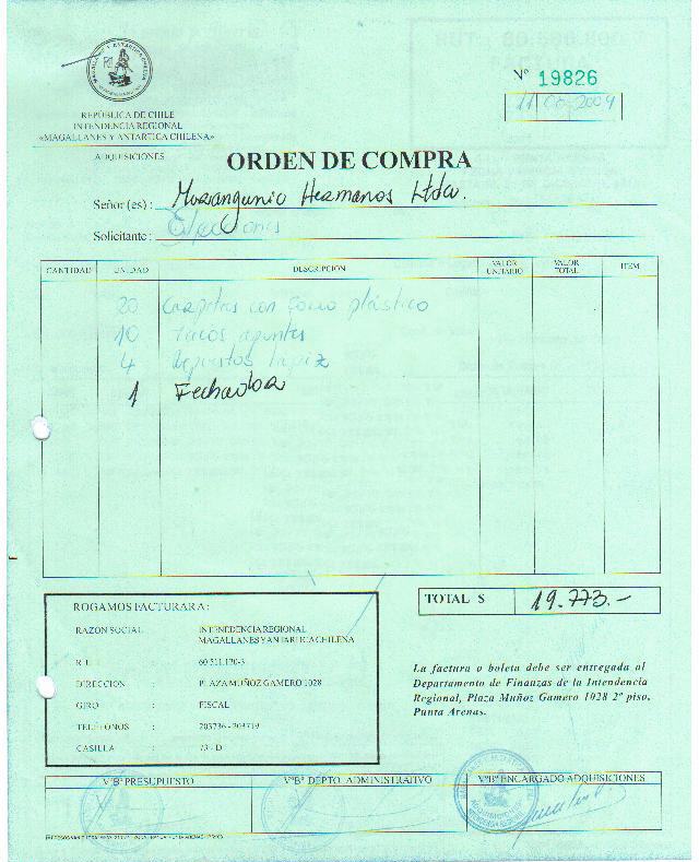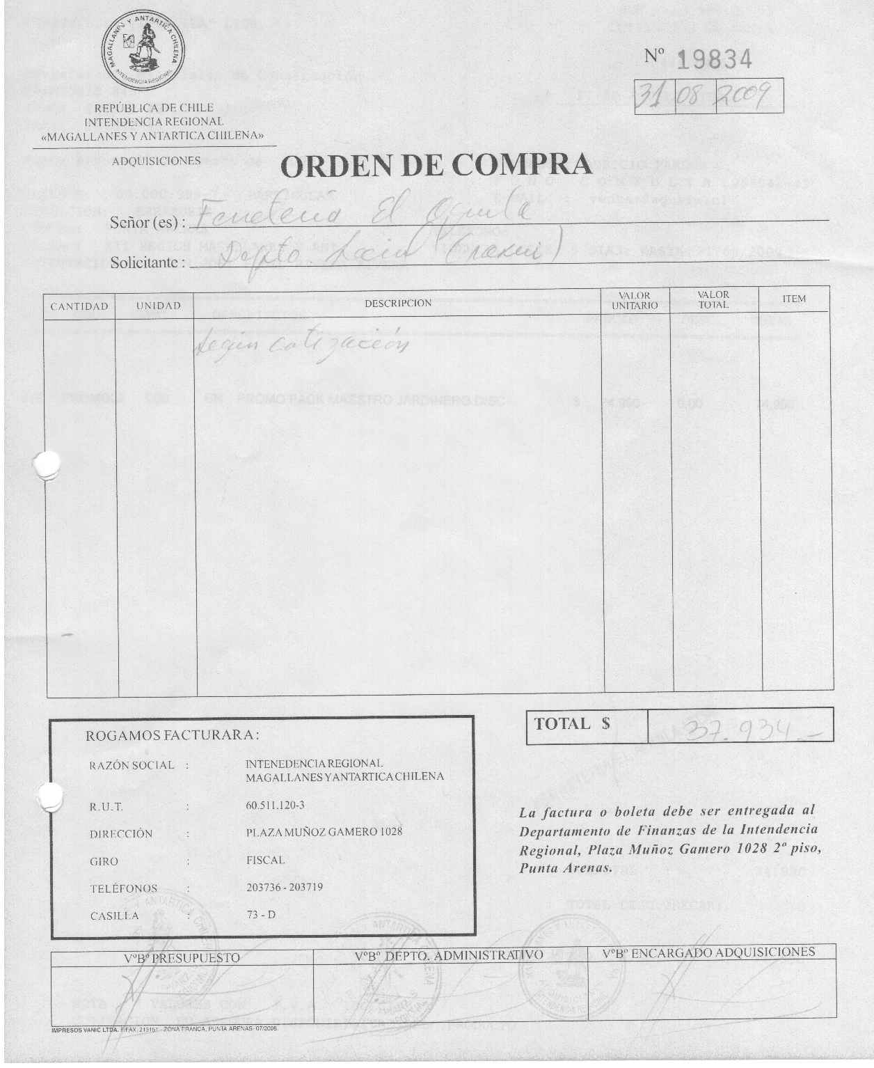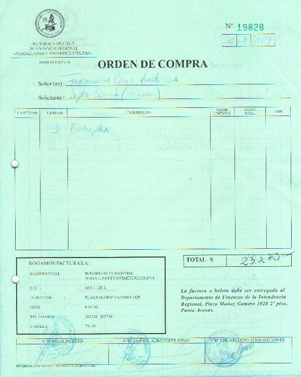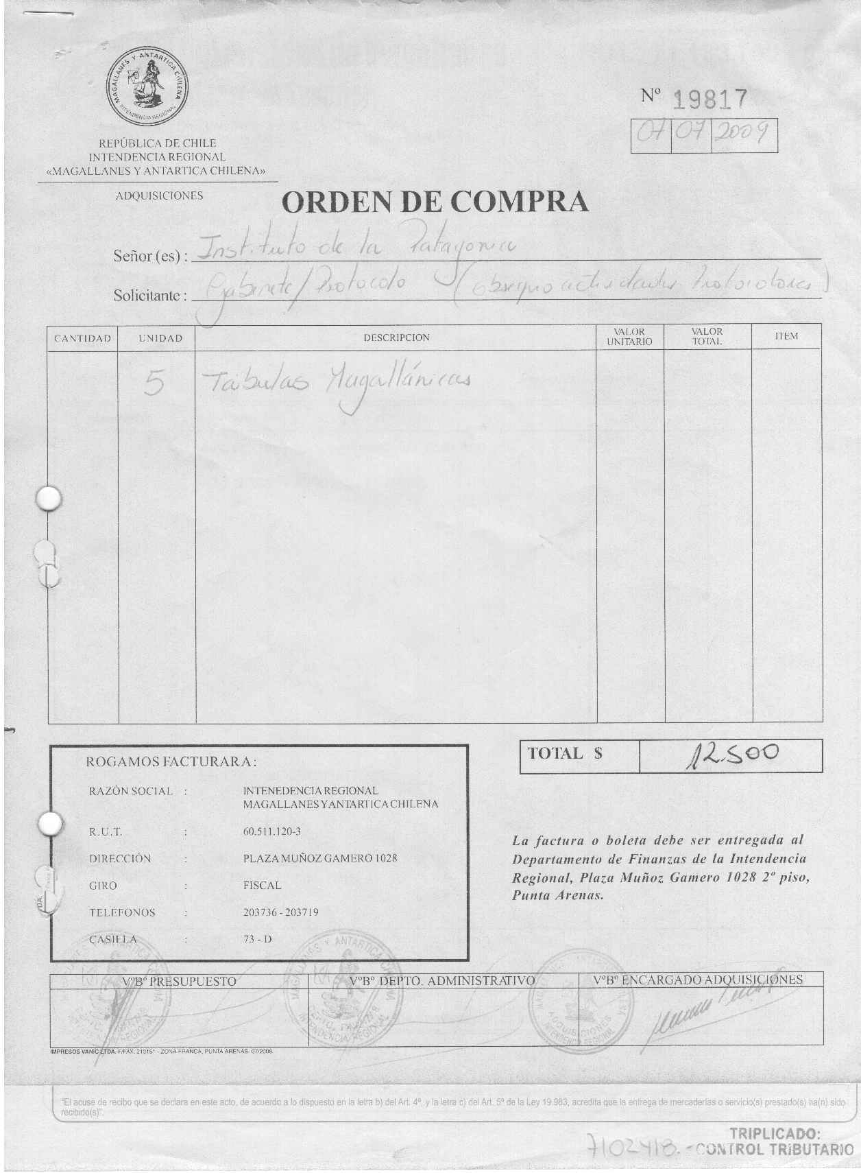 | 93 | 07/07/2009 | Orden de Compra N° 19817 | Obsequios, 5 tábulas magallánicas | 07/07/2009 | 07/07/2009 | Pesos | 12.500 | Instituto de la Patagonia | 71.133.700-8 | Ver enlace | - | null | ||||