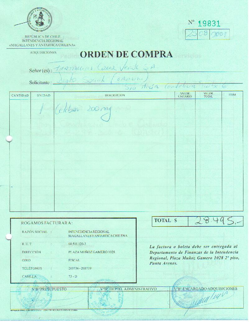 | 69 | 25/08/2009 | Orden de Compra N° 19831 | Orasmi - Medicamento ayuda social | 25/08/2009 | 25/08/2009 | Pesos | 28.495 | Farmacias Cruz Verde S.A | 89.807.200-2 | Ver enlace | - | null | ||||