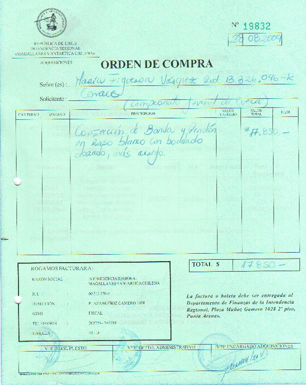 | 70 | 25/08/2009 | Orden de Compra N° 19832 | Conace - confección de banda y pendón | 28/08/2009 | 28/08/2009 | Pesos | 17.850 | María Figueroa Vásquez | 13.326.096-K | Ver enlace | - | null | ||||