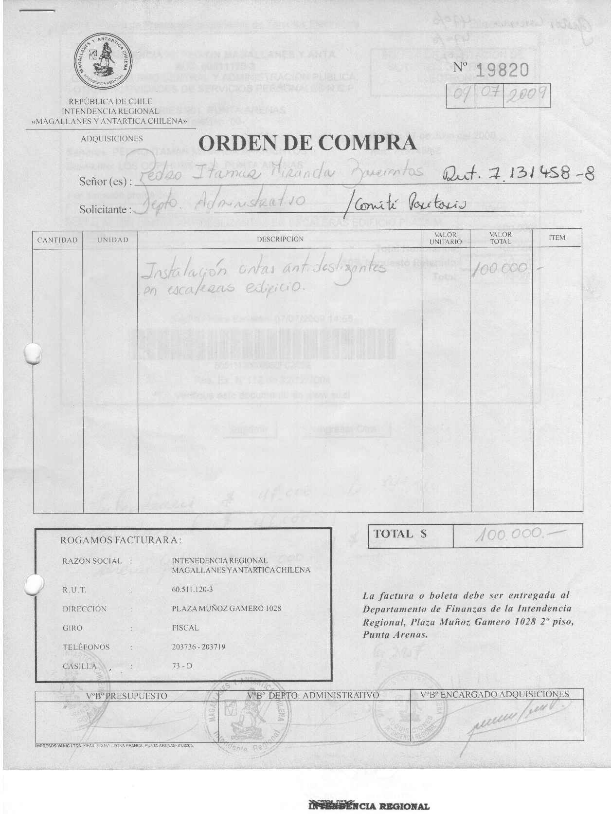 | 96 | 09/07/2009 | Orden de Compra N° 19820 | Comité Paritario, Instalación cintas antides | 09/07/2009 | 09/07/2009 | Pesos | 100.000 | Pedro Miranda Barrientos | 7.131.458-8 | Ver enlace | - | null | ||||