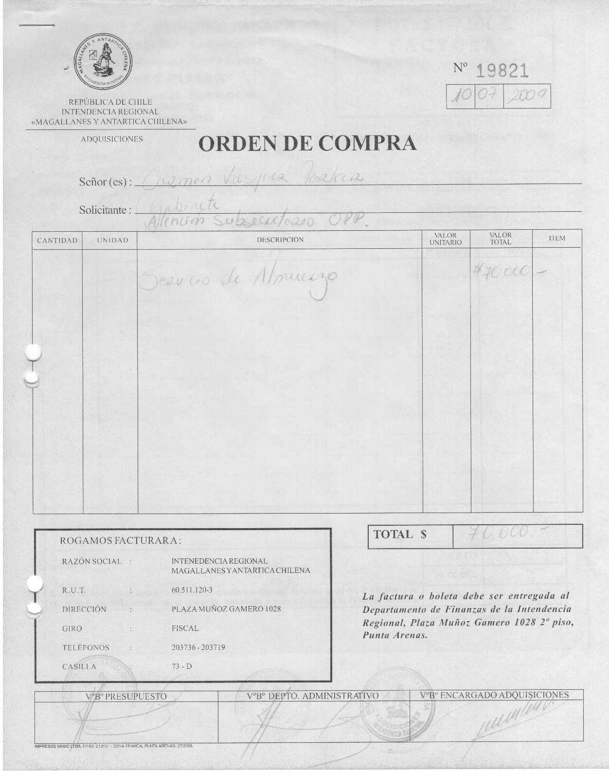 | 97 | 10/07/2009 | Orden de Compra N° 19821 | Servicio de almuerzo Subsecretario OPP | 10/07/2009 | 10/07/2009 | Pesos | 70.000 | Carmen Vásquez Parker | 8.497.501-K | Ver enlace | - | null | ||||