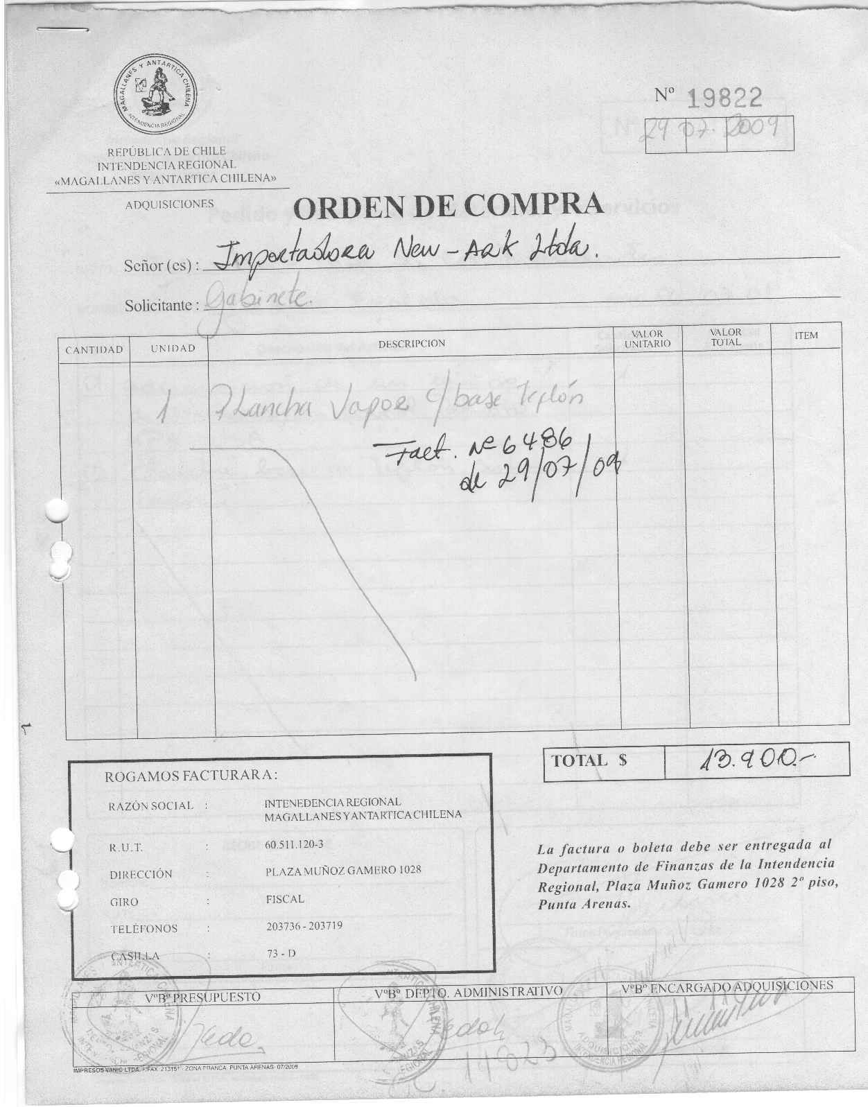 | 98 | 29/07/2009 | Orden de Compra N° 19822 | Plancha de vapor con base de teflón | 29/07/2009 | 29/07/2009 | Pesos | 13.900 | Importadora New Ark Ltda. | Ver enlace | - | null | |||||