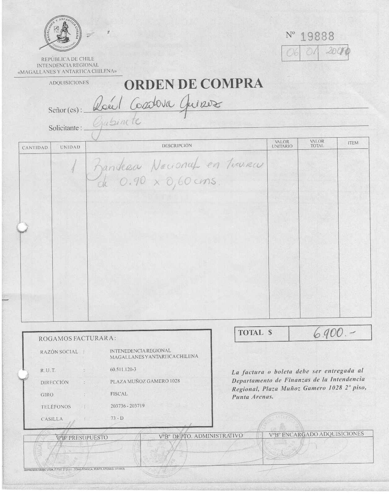 | 2 | 06/01/2010 | Orden de compra N° 19888 | Bandera nacional trevira 0,90x0,60 cms | 06/01/2010 | 06/01/2010 | pesos | 6.900 | Comercial Rauco | Cordova | Quiroz | Raul | 2,739,119-2 | Ver enlace | |