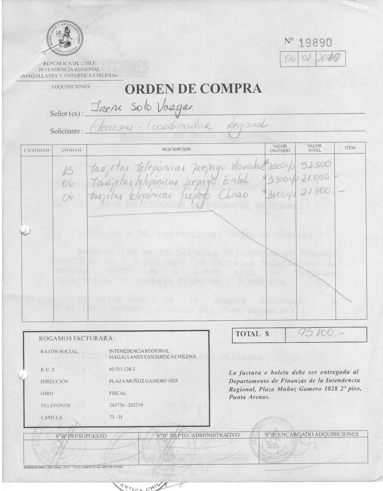 | 4 | 06/01/2010 | Orden de compra N° 19890 | Elecciones, tarjetas telefonicas pre pago | 06/01/2010 | 06/01/2010 | pesos | 95.100 | Kisco Compadre Soto | soto | vargas | Irene | Ver enlace | ||
