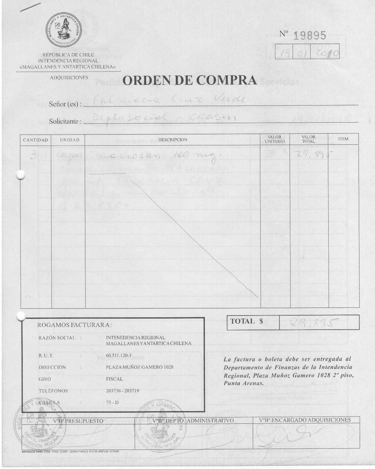 | 9 | 19/01/2010 | Orden de compra N° 19895 | Orasmi, ayuda social compra de macrosan | 19/01/2010 | 19/01/2010 | pesos | 29.895 | Farmacias Cruz Verde S.A. | 89,807,200-2 | Ver enlace | ||||