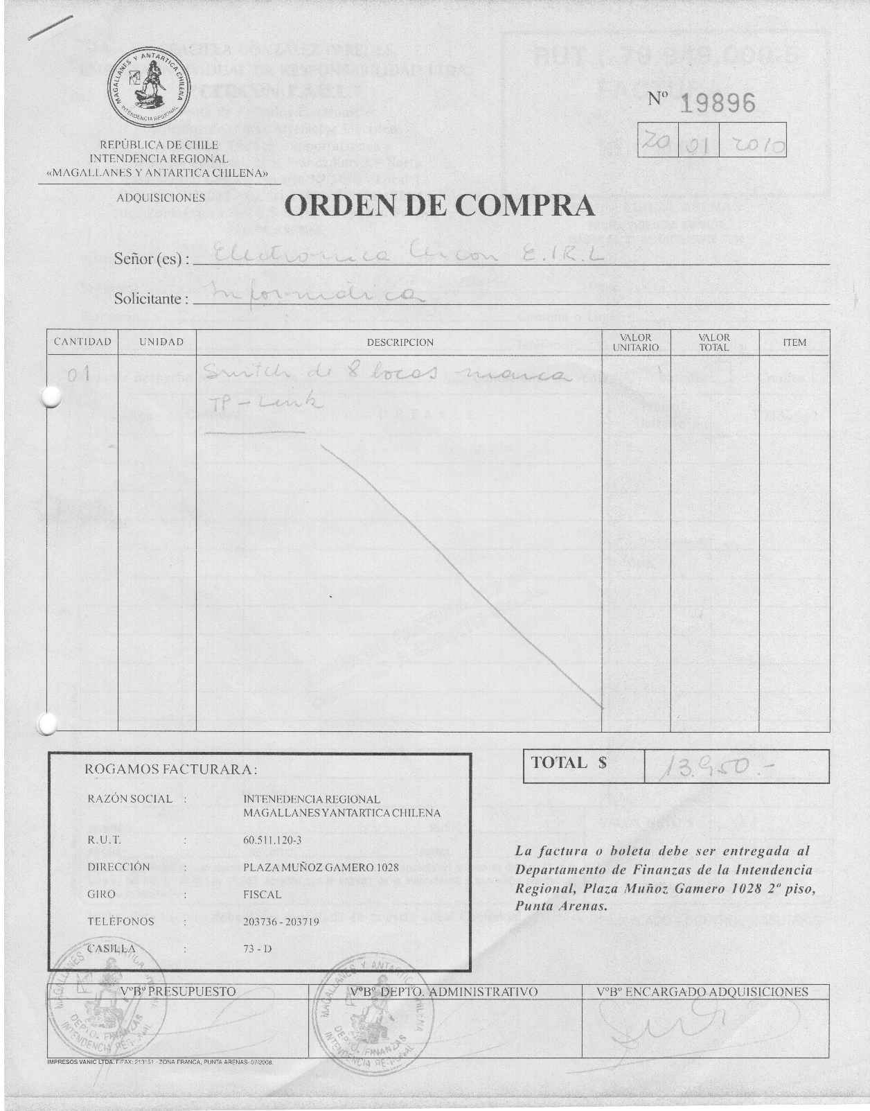| 10 | 20/01/2010 | Orden de compra N° 19896 | un switch de 8 bocas | 20/01/2010 | 20/01/2010 | pesos | 13.950 | Cercon E.I.R.L. | Gonzalez | Paredes | Graciela | 79,949,000-5 | Ver enlace | |