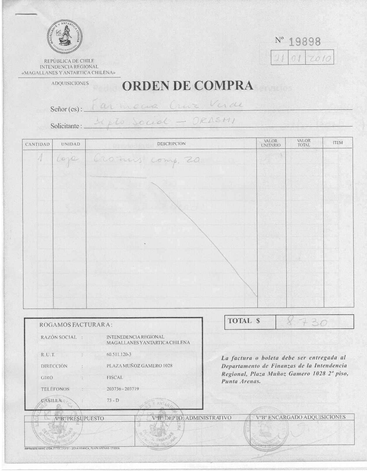 | 12 | 21/01/2010 | Orden de compra N| 19898 | Cronus comp. 20 | 21/01/2010 | 21/01/2010 | pesos | 8.730 | Farmacia Cruz Verde | Ver enlace | |||||