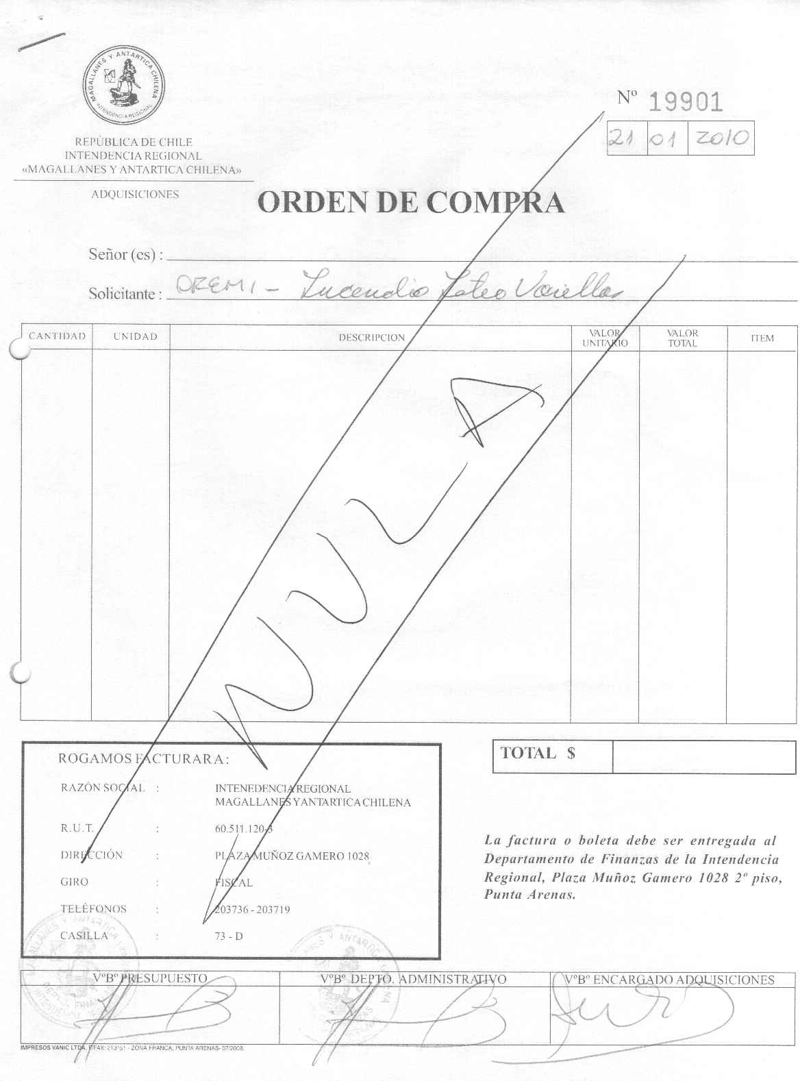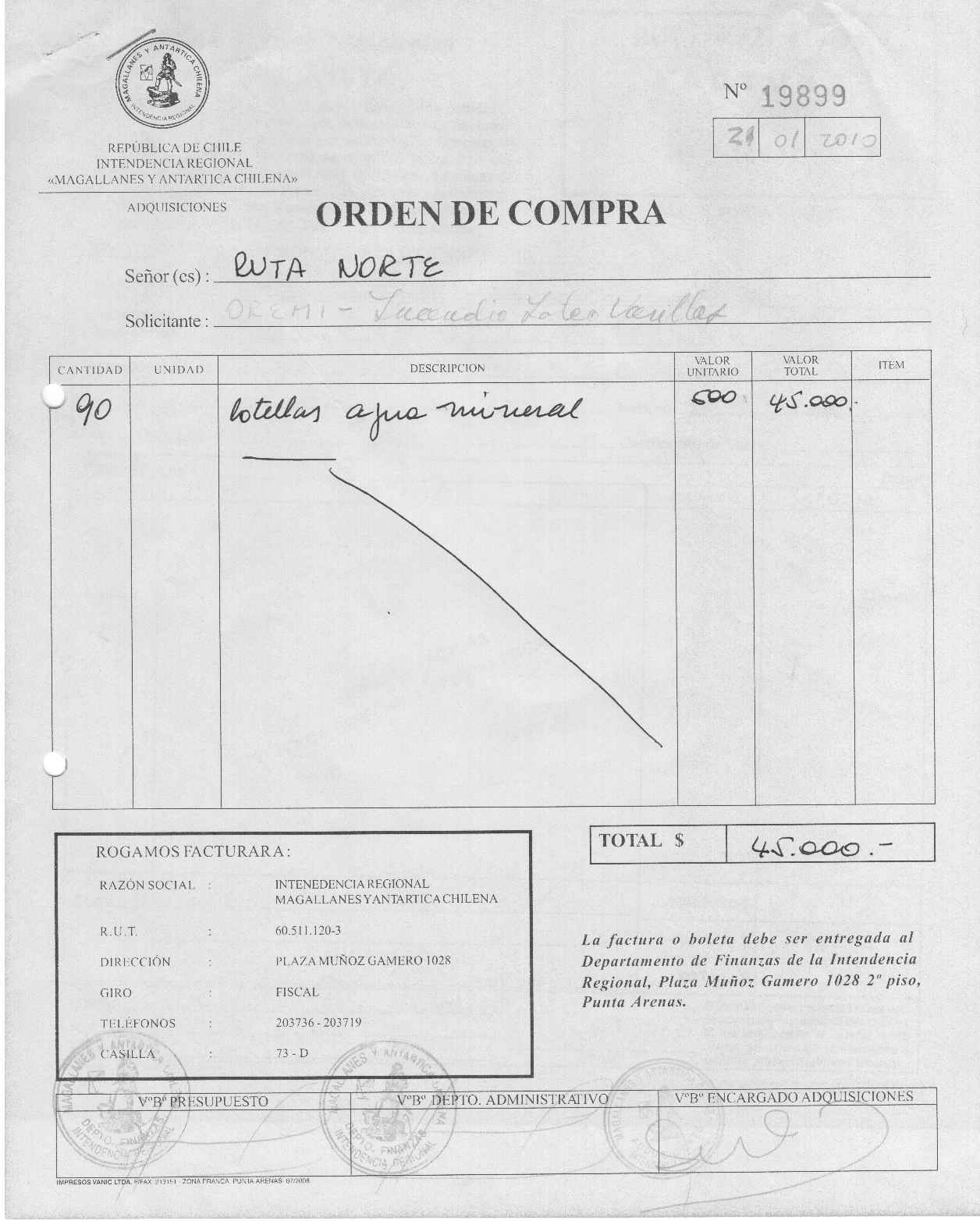 | 13 | 21/01/2010 | Orden de compra N° 19899 | botellas agua mineral | 21/01/2010 | 21/01/2010 | pesos | 45.000 | Ruta Norte | Cisterna | Arriagada | Egon | 4,921,440-5 | Ver enlace | |