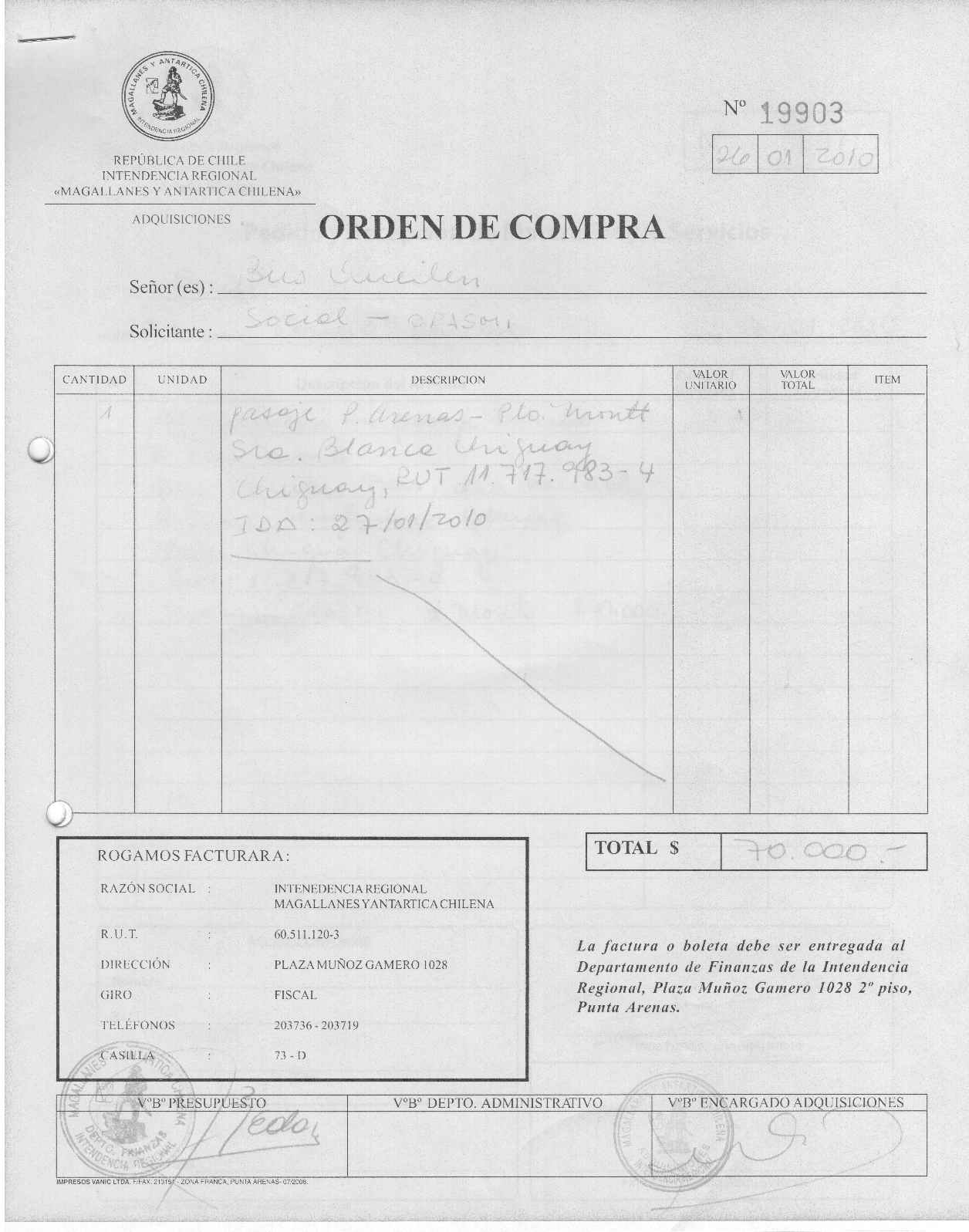 | 17 | 26/01/2010 | Orden de compra N° 19903 | ORASMI, pasaje PA-Pto.Montt | 26/01/2010 | 26/01/2010 | pesos | 70.000 | Bus Queilen | 79,904,570-2 | Ver enlace | ||||