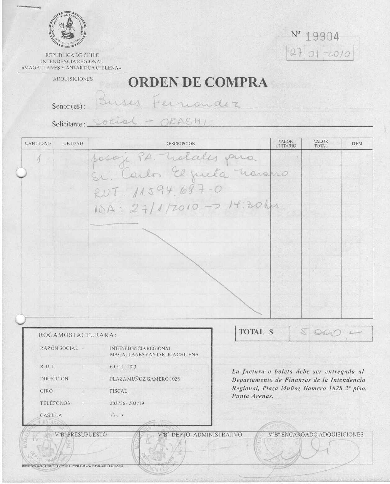 | 18 | 27/01/2010 | Orden de compra N° 19904 | ORASMI, pasaje PA-Natales | 27/01/2010 | 27/01/2010 | pesos | 5.000 | Buses Fernandez | 77,492,710-7 | Ver enlace | ||||