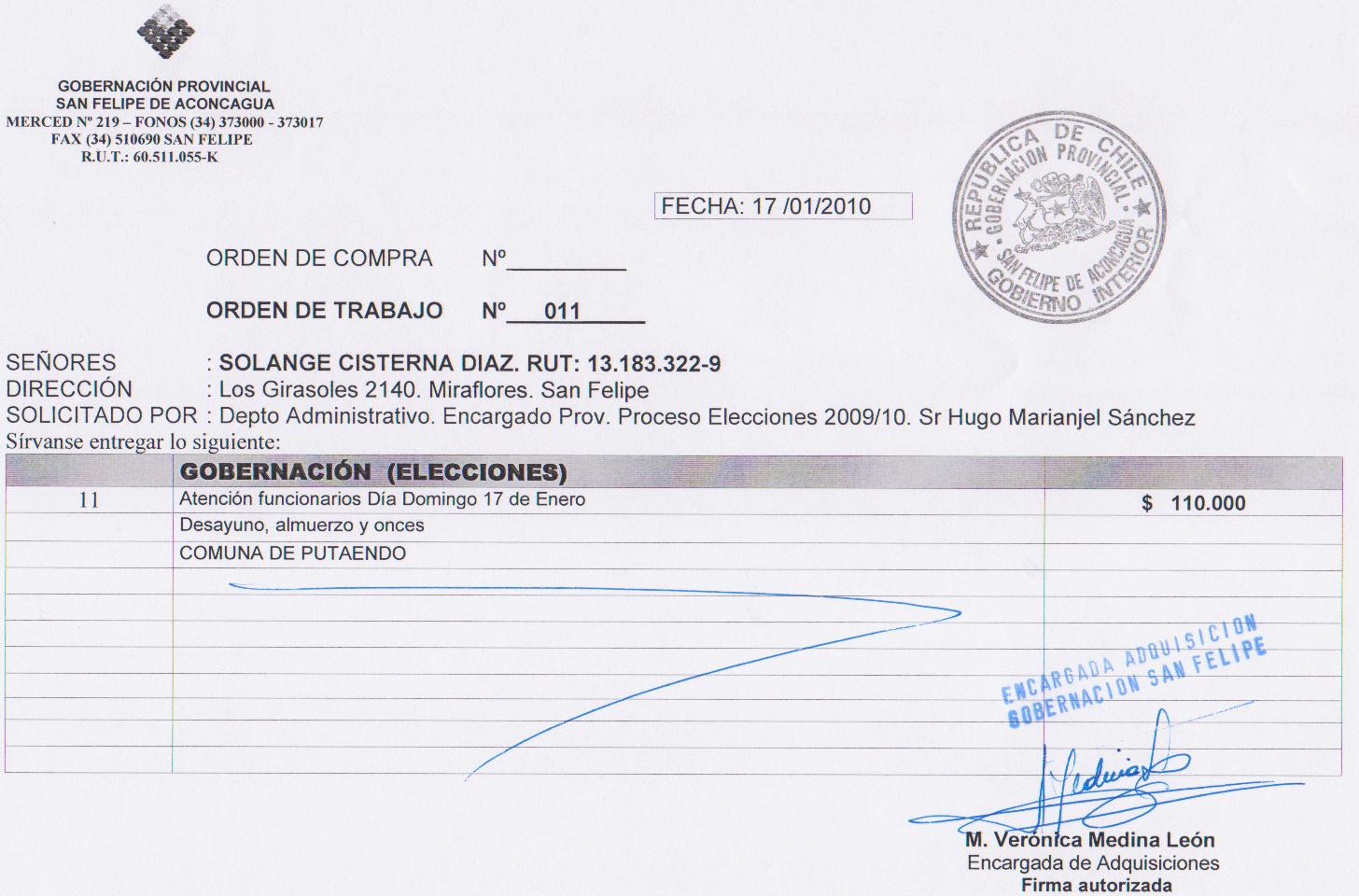 11 17/01/2010  Orden de Compra N° 011  Colación Equipo Putaendo  17/01/2010  17/01/2010  Pesos  110000  SOLANGE CISTERNA DÍAZ  Cisterna  Díaz  Solange  13.183.322-9    Ver enlace