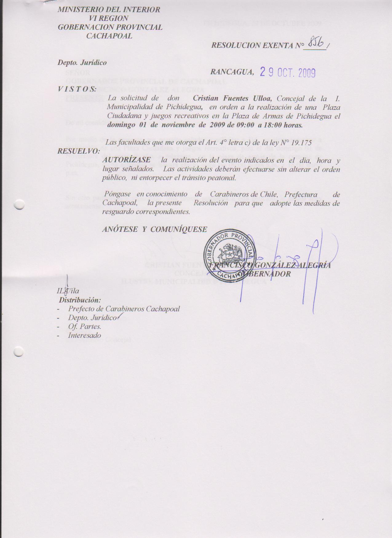 AUTORIZA PLAZA CIUDADANA EN LA COMUNA DE PICHIDEGUA |