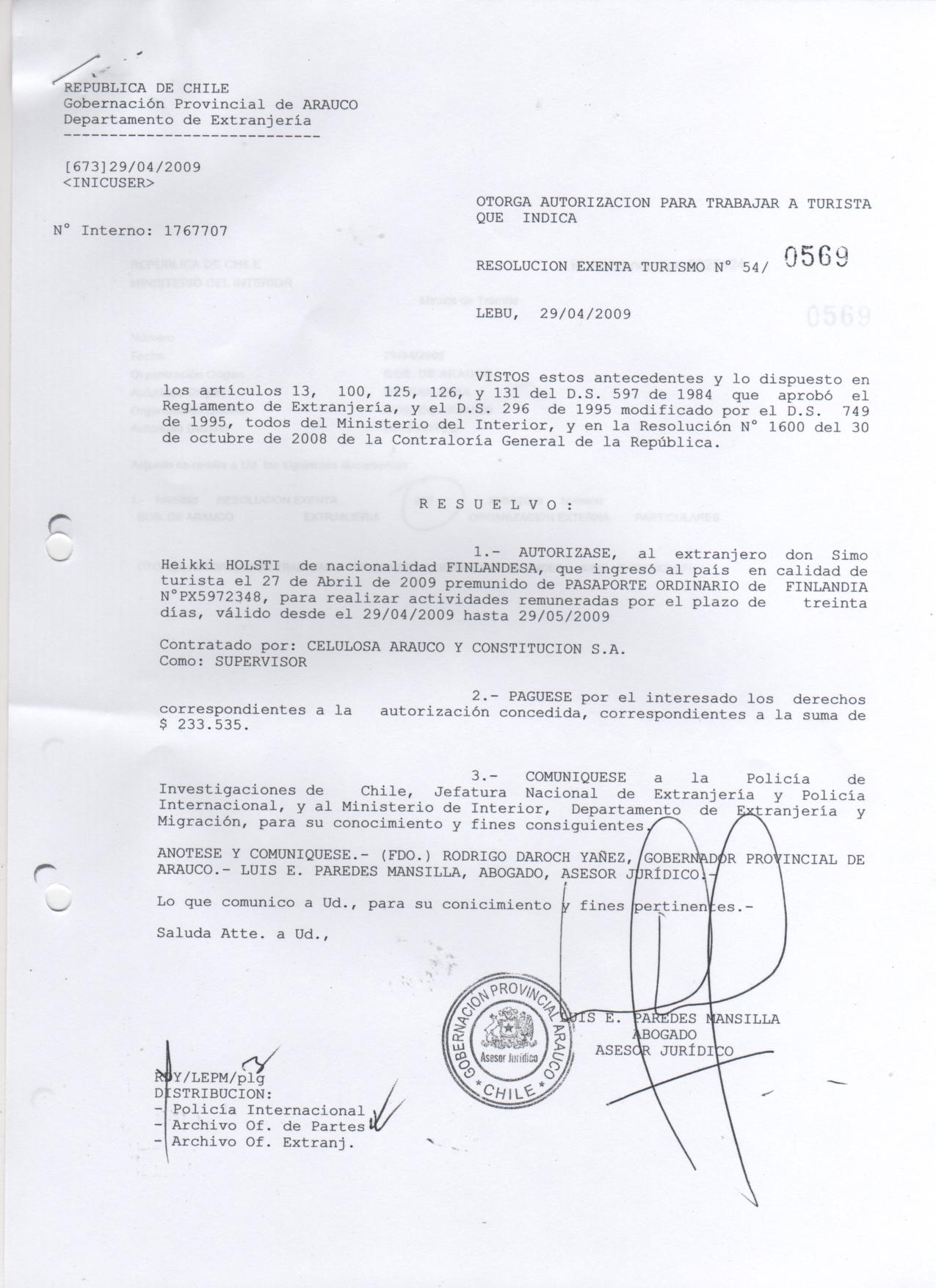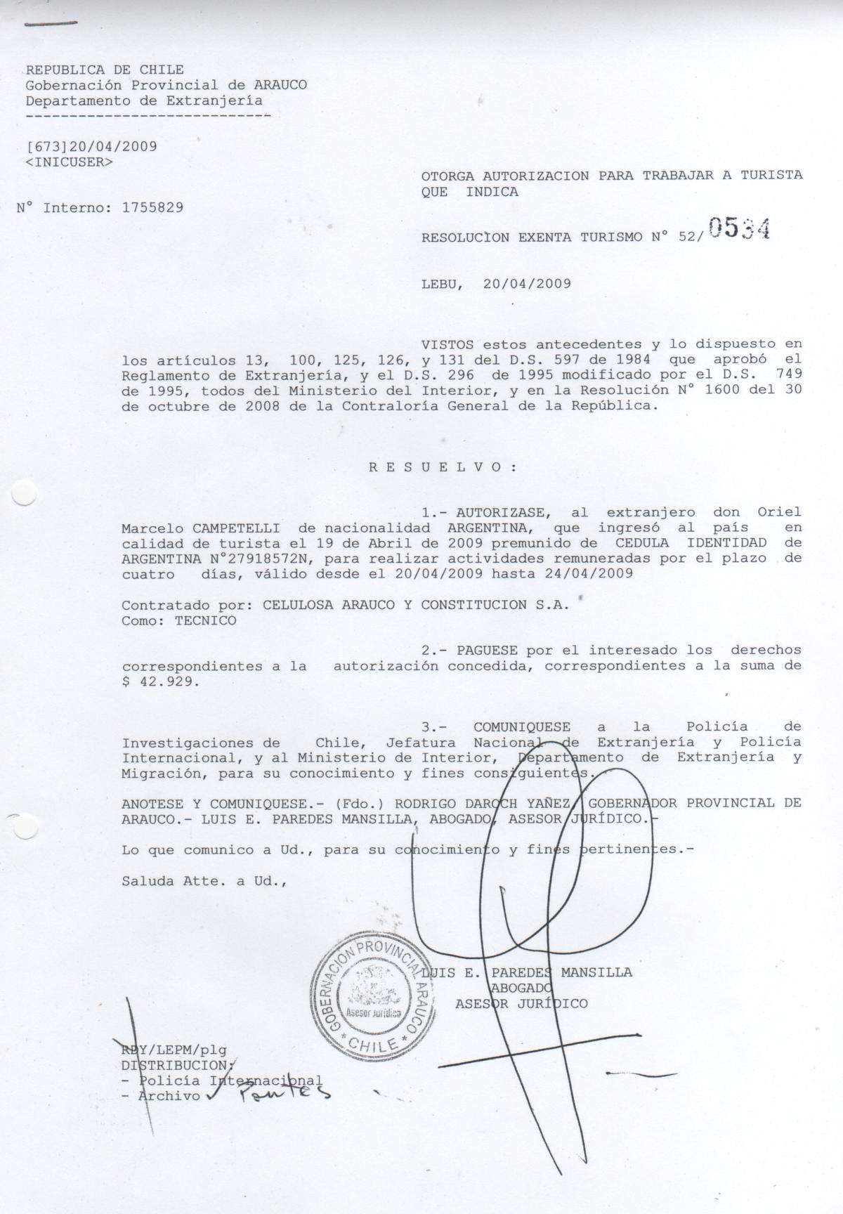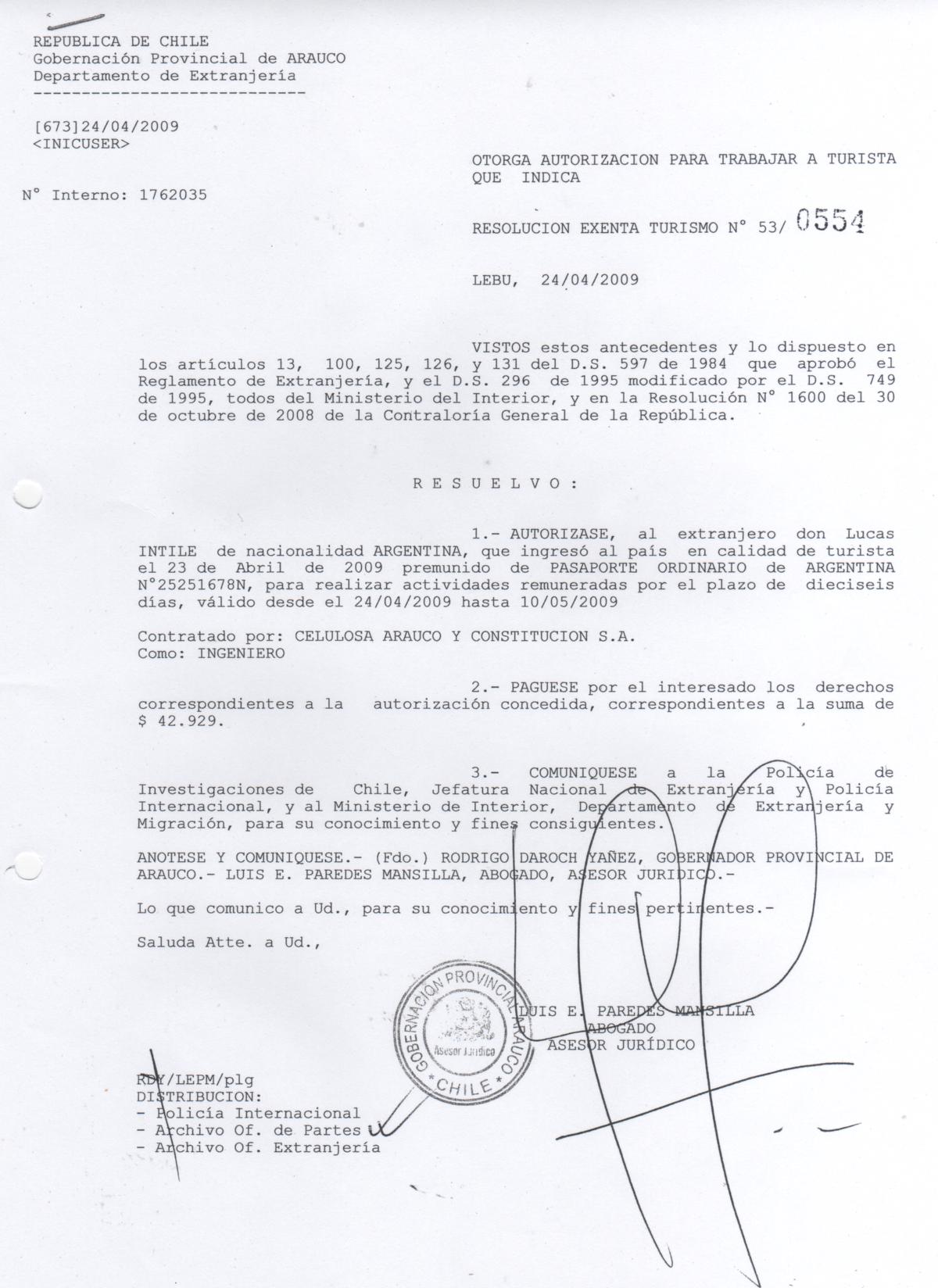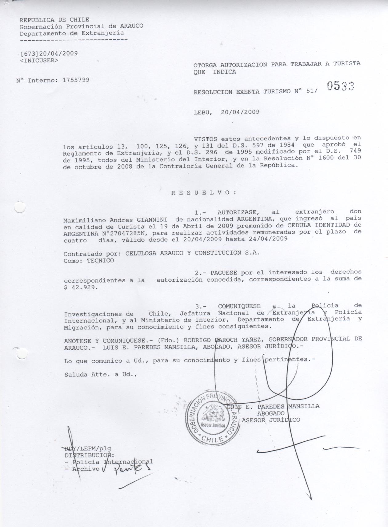 Otorgase autorización para trabaja a turista de nacionalidad argentina |
