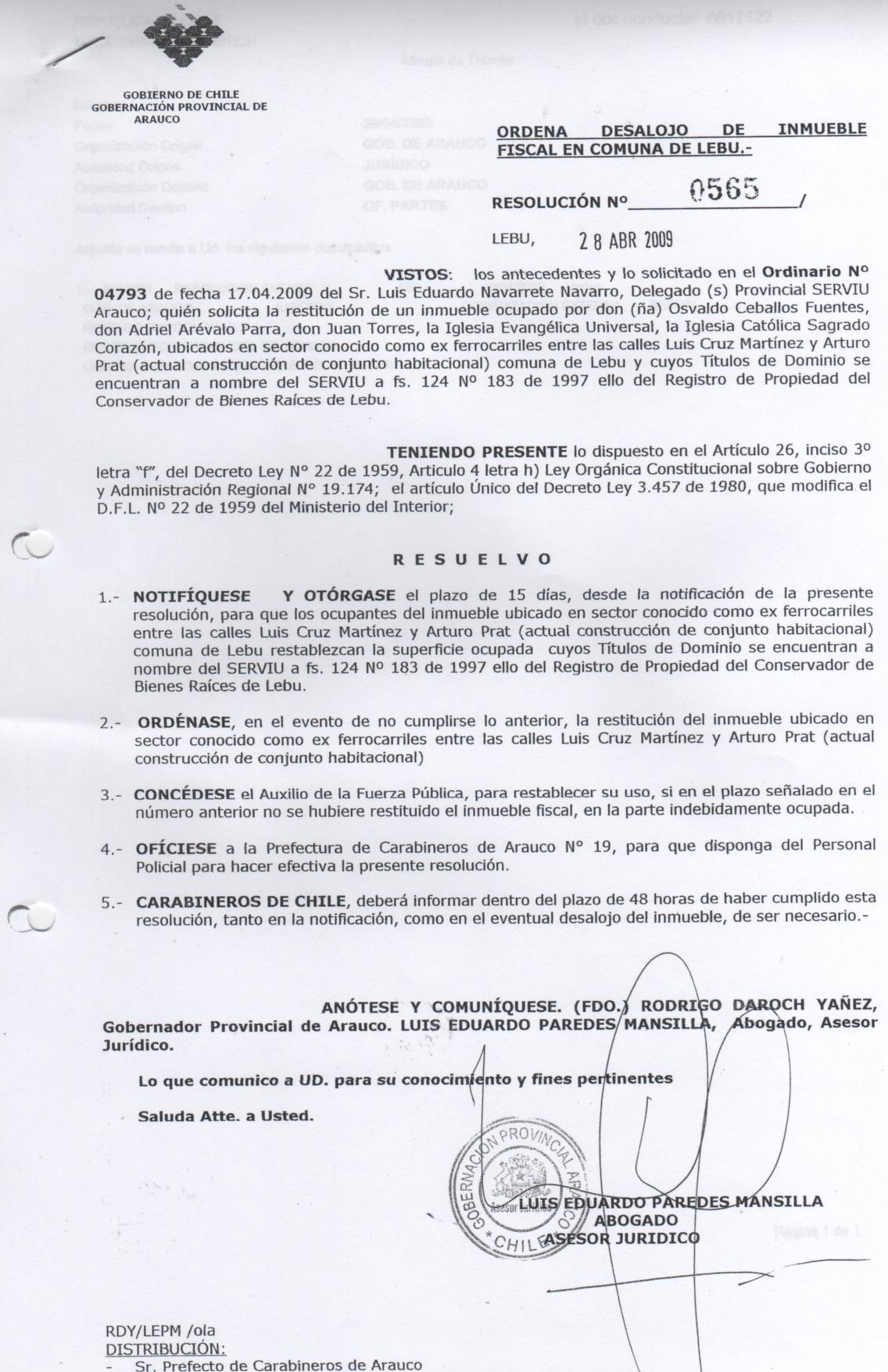 Ordenase el desalojo de inmueble fiscal en comuna de Lebu. |