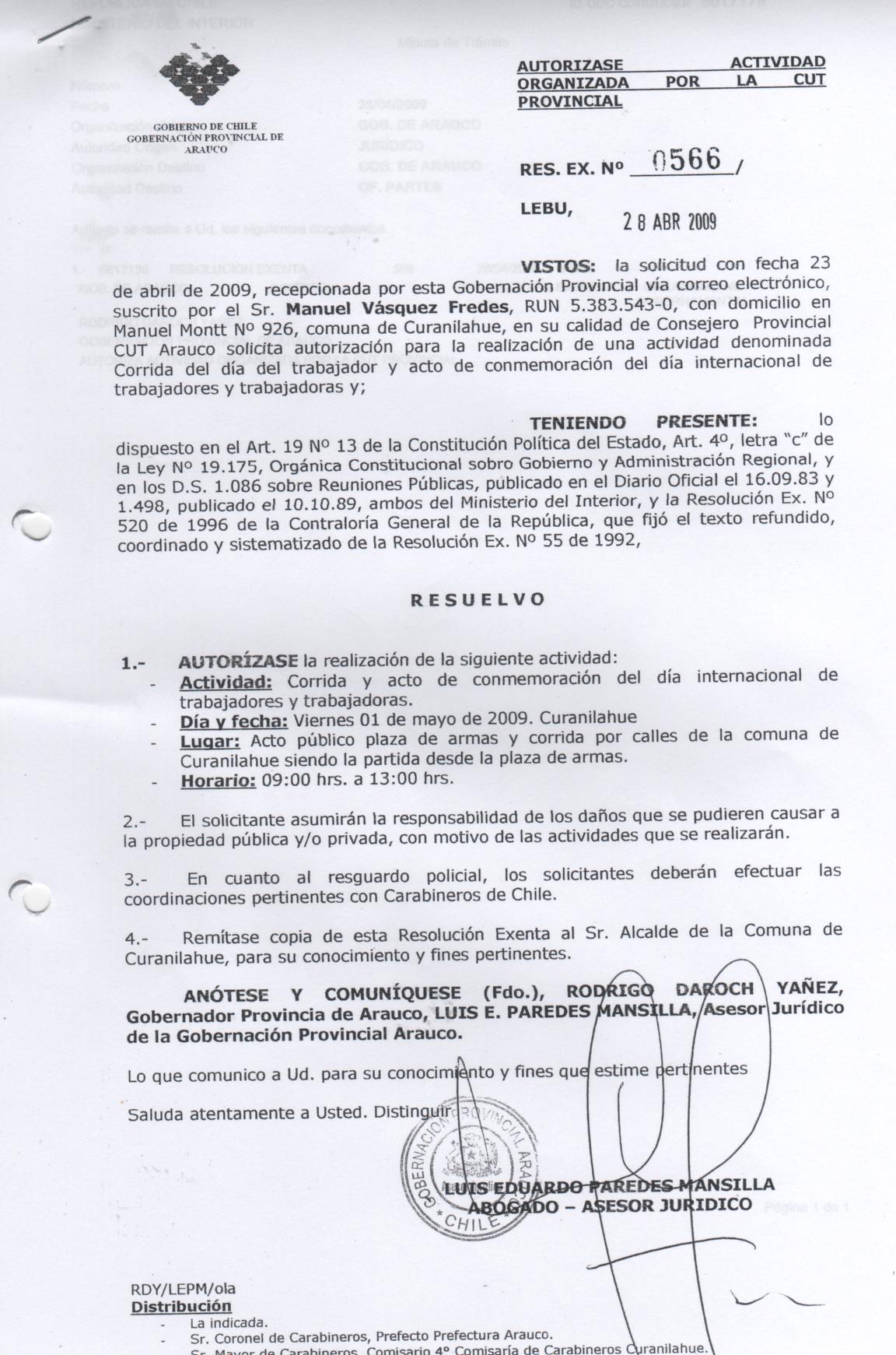 Autorizase actividad denominada corrida y acto de conmemoración del día internacional del trabajador. |